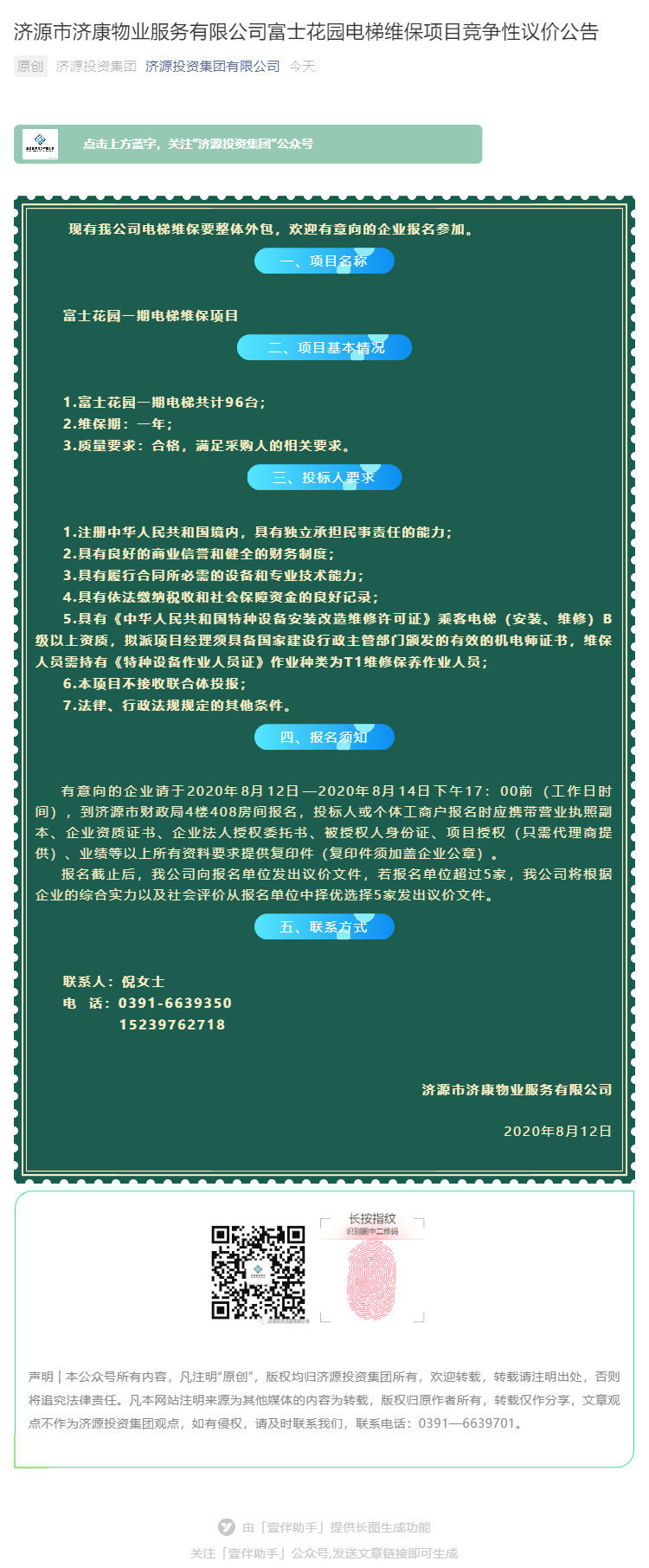 濟源市濟康物業(yè)服務(wù)有限公司富士花園電梯維保項目競爭性議價公告