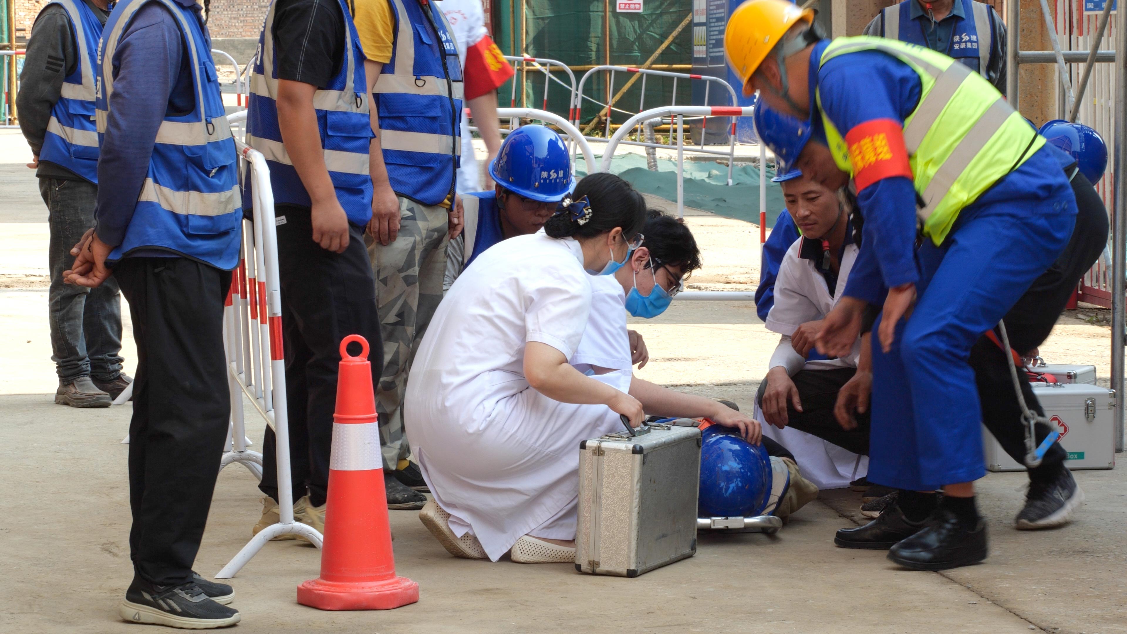 ?“濟(jì)源衛(wèi)河康養(yǎng)中心項(xiàng)目3號樓西側(cè)一名外墻抹灰工人從活動腳手架上墜落”“各小組注意,立刻集合,迅速到達(dá)事故現(xiàn)場,按照應(yīng)急預(yù)案實(shí)施救援!”