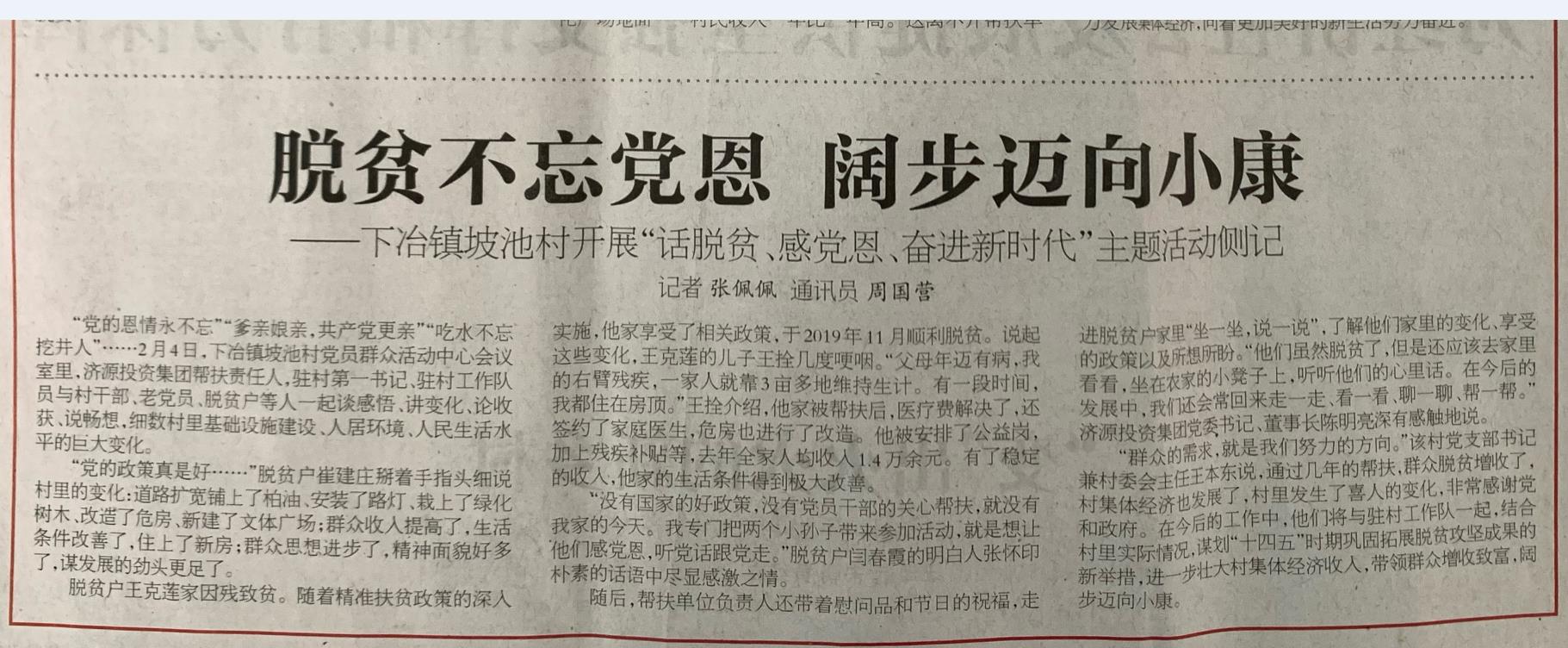 “黨的恩情永不忘”“爹親娘親,共產(chǎn)黨更親”“吃水不忘挖井人”……2月4日,下冶鎮(zhèn)坡池村黨員群眾活動(dòng)中心會(huì)議室里,濟(jì)源投資集團(tuán)幫扶責(zé)任人,駐村第一書(shū)記、駐村工作隊(duì)員與村干部、老黨員、脫貧戶等人一起談感悟、講變化、論收獲、說(shuō)暢想,細(xì)數(shù)村里基礎(chǔ)設(shè)施建設(shè)、人居環(huán)境、人民生活水平的巨大變化。